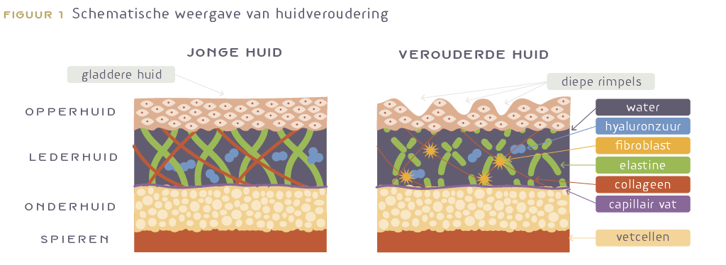 Met het ouder worden ondergaat de huid diverse veranderingen in de fysieke, morfologische en fysiologische eigenschappen van de verschillende lagen. De huid wordt dunner, verliest vocht, vermindert in elasticiteit en vertoont rimpels (zie figuur 1). Huidveroudering is een complex, multifactorieel proces dat het gevolg is van een combinatie van chronologische veroudering en fotoveroudering.2,3,4