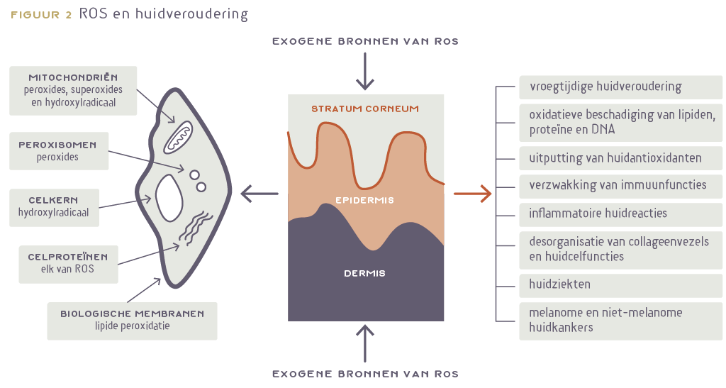 Resultaten uit onderzoek suggereren dat oxidatieve schade invloed heeft op de algehele vitaliteit van het lichaam en een sleutelrol speelt in huidveroudering (zie figuur 2). ROS zijn moleculen die kunnen ontstaan tijdens de ontkoppeling van elektronen in biochemische processen of onder invloed van externe factoren zoals UV-straling. Vanwege hun biochemische activiteit binden ze zich gemakkelijk aan andere moleculen. Een overvloed aan vrije radicalen, vooral wanneer het lichaam niet over voldoende antioxidanten beschikt, kan ernstige schade toebrengen aan cellulaire structuren, wat tot oxidatieve stress (OS) leidt. OS ontstaat wanneer de balans tussen de productie van vrije radicalen en het vermogen van het lichaam om deze te neutraliseren, verstoord raakt. Dit kan leiden tot systemische schade aan cellulaire structuren, wat de veerkracht van het lichaam aantast. In de huid versnelt OS de afbraak van essentiële huidstructuren zoals collageen en elastine, die zorgen voor stevigheid en elasticiteit van de huid. Dit versterkt zichtbare tekenen van veroudering zoals rimpelvorming, verlies van huidelasticiteit, droogheid en pigmentatieverschillen.1,2,3,11,12